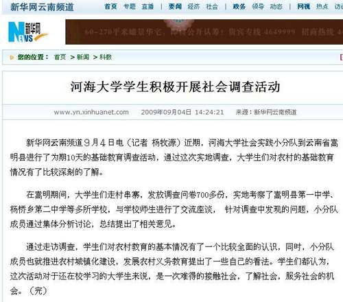 | 5. | 计信学院赴云南嵩明社会实践小分队 | 1. 新华网云南频道 2. 昆明科技报 河海大学与嵩明共建友谊 |
