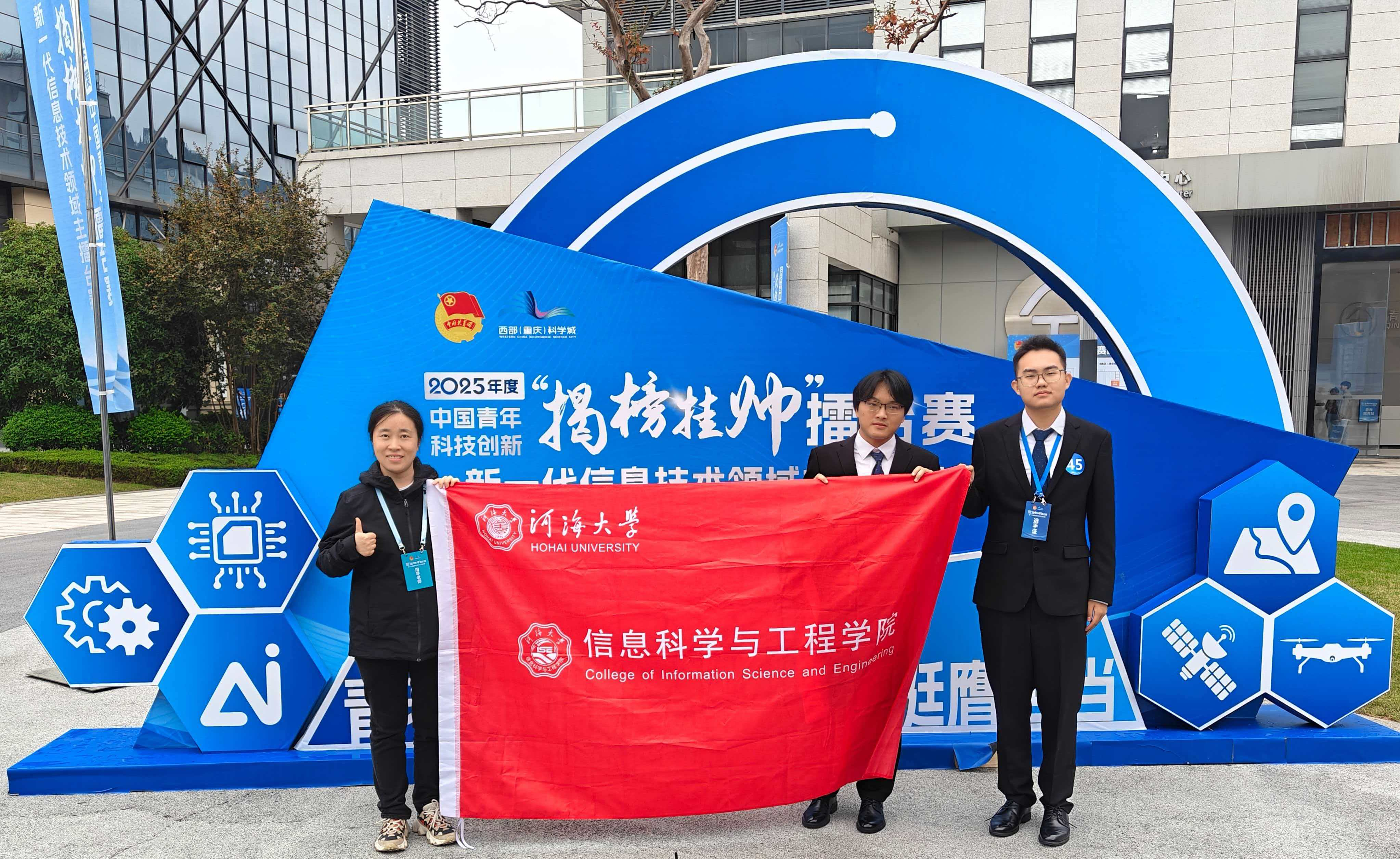 10月中下旬,2025年度中国青年科技创新“揭榜挂帅”擂台赛新一代信息技术领域终审主擂台赛和人工智能领域终审主擂台赛分别在西部科学城重庆高新区和上海市徐汇区举行,信息科学与工程学院推报的科技发明制作项目《基于星地一体化异构网络通信技术研究》荣获全国特等奖、《基于国产算力的无人机水域感知与推理系统》荣获全国三等奖。