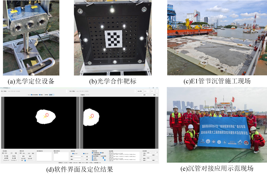 为提高不利水体下光学定位的精度,提出并研发了双目偏振视觉与激光测距融合的水下高精度定位方法;同时,考虑不利水体衰减带来的作用距离降低与水体散射带来成像质量退化等影响,联合中国船舶集团有限公司第七一七研究所研发了主、被动联合的水下光学合作靶标。研发的设备经权威机构检测,在透明度为0.7m水体中探测距离可达3m,定位精度可达1mm。设备在国家级重大工程——广州鱼珠隧道沉管对接施工中得到了应用示范。鱼珠隧道位于广州城市发展的核心区域,连接海珠区、天河区和黄埔区,采用沉管隧道方式下穿珠江。在沉管对接过程中,团队将光学定位设备安装于固定沉管(E1管节)一端,合作靶标安装于待对接沉管(E2管节)一端,当E2管节经北斗、声呐等辅助手段引导至E1管节约3–5米范围内时,启动光学定位设备与合作靶标,进入高精度光学定位阶段,利用自研软件实现图像采集、合作靶标光源控制、激光测距、图像去散射和光学定位功能。针对珠江流域高浊度水体,在图像去散射的基础上,通过提取靶标光斑实现mm级的全自动水下光学定位,实现了沉管的精准对接。