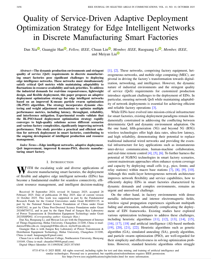 论文信息:Xia, D., Han, G., Lin, C. et al. Quality of Service-Driven Adaptive Deployment Optimization Strategy for Edge Intelligent Networks in Discrete Manufacturing Smart Factories. IEEE Journal on Selected Areas in Communications, vol. 43, no. 10, pp. 3456-3471, 2025.