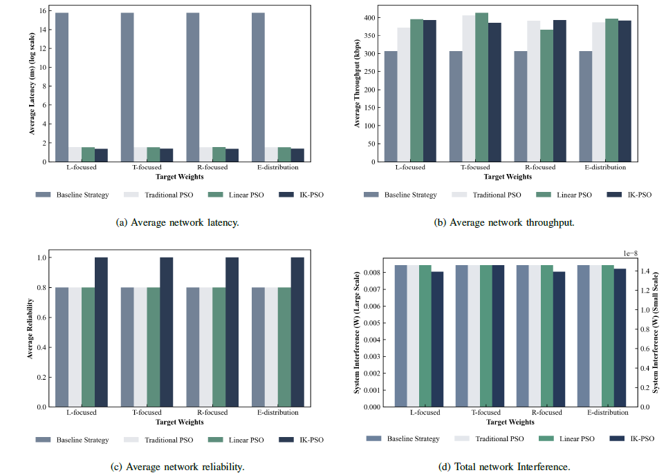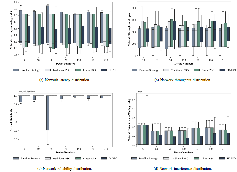 实验结果表明,在不同QoS需求下,所提策略能够快速收敛至高质量解(如图4)。与多种对比方法相比,该策略在关键性能指标上表现出显著优势:1)网络时延:相比基准策略和传统PSO策略,平均时延分别降低约90%和10%;2)网络吞吐量:较基准策略和传统PSO策略分别提升约28%和6%;3)网络可靠性:数据包成功传输率稳定在98%以上,显著高于对比算法,可更好满足智能设备的高可靠通信需求;4)网络干扰:通过优化基站部署与资源分配,有效抑制共信道干扰。所提策略可将干扰功率最高降低5个数量级。此外,所提策略在不同设备密度下也展现出较强的稳定性与鲁棒性,性能波动小(如图5)。综合来看,IK-PSO通过动态聚类初始化、自适应权重更新与多目标优化机制,实现了对边缘智能网络部署的高效求解。