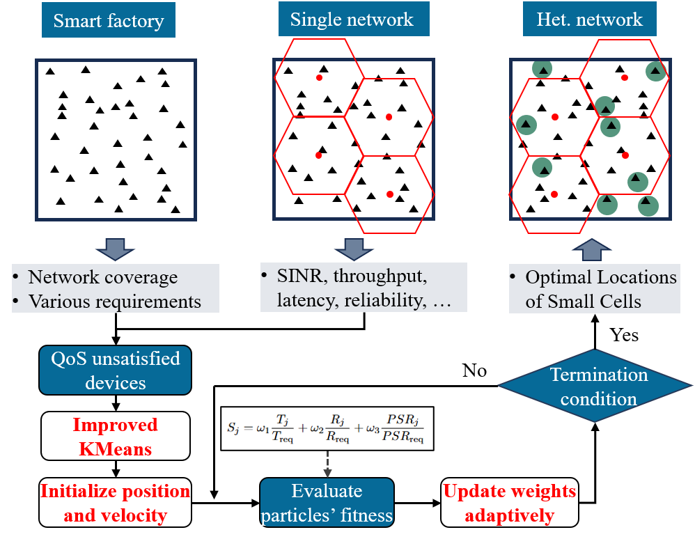 随着离散制造智能工厂规模不断扩大,生产流程高度动态化,对工业网络的实时性、可靠性与灵活性提出了前所未有的挑战。传统静态网络部署方式难以适应设备布局频繁调整、任务优先级动态变化以及复杂电磁环境下的信号干扰等问题,严重制约了智能制造系统的智能化水平与运行效率。研究团队构建了面向离散制造场景的异构蜂窝网络架构(如图2)。其中,宏基站负责广域覆盖,小基站则根据实际需求灵活部署,以增强信号薄弱区域的网络服务能力。小基站通过无线前传技术而非传统有线连接与宏基站相连,提升网络对产线布局动态调整的适应能力与部署灵活性。